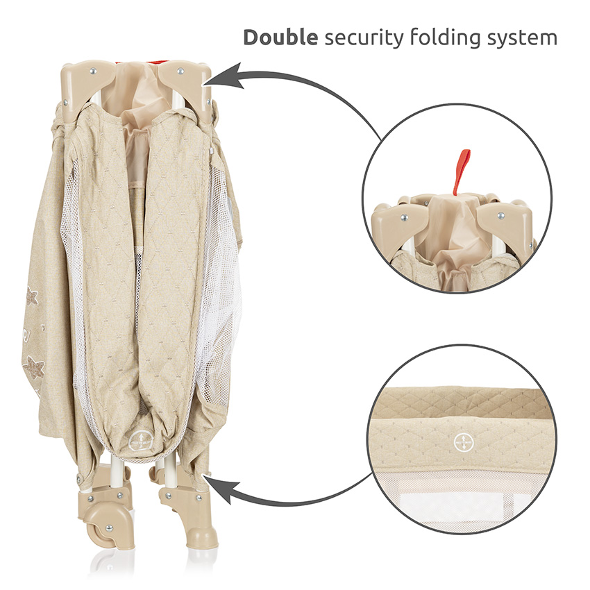 Εάν χρησιμοποιείτε το παρκοκρέβατο έξω , καθαρίστε τη σκόνη που προσκολλάται στα πόδια και από τα άλλα στοιχεία καθώς η σκόνη στον μηχανισμό μανδάλωσης μπορεί να προκαλέσει σοβαρές ζημιές.
